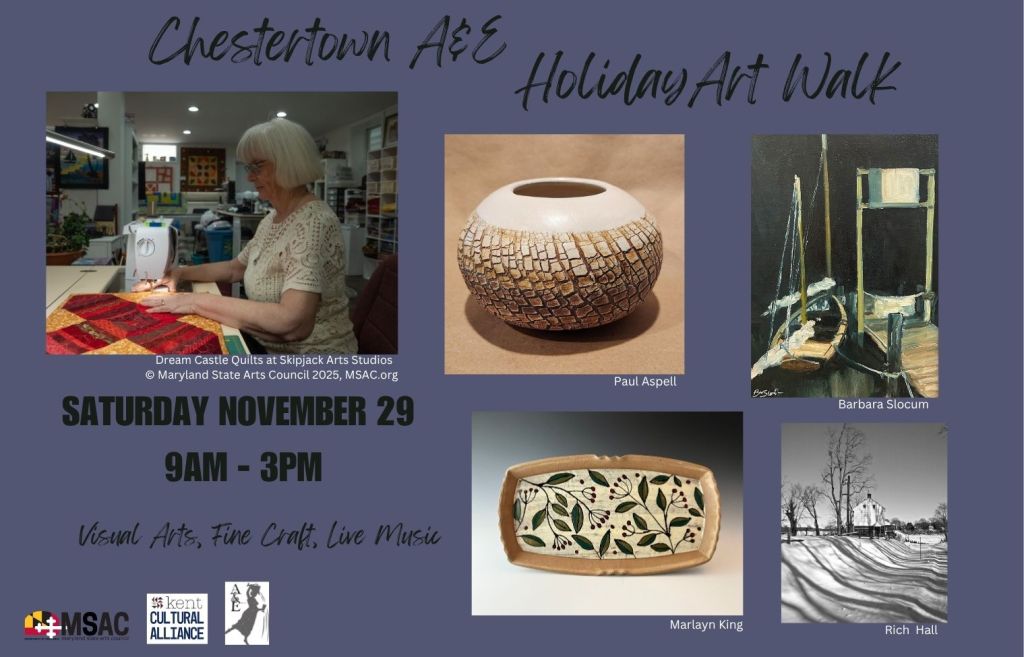 Don’t miss this free, self-guided tour with the opportunity to meet over 30 artists in their own studios. You’ll be able to observe them working in a broad range of media including painting, photography, printmaking, jewelry, pottery, glass, metal, wood, and fiber. Start at the Chestertown RiverArts Gallery at 343 High Street in Chestertown, MD, pick up a brochure that includes a map to guide you to each studio. In addition, be sure to peek in the windows of many downtown locations, where you will find some of their works on display.