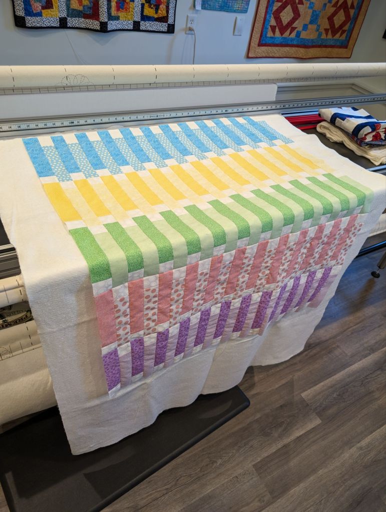 I also, assembled this beautiful baby quilt in pastel colors. It gets quilted today on my Long Arm.