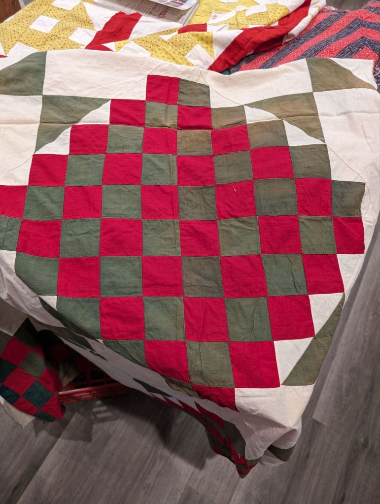 This block was first published by the Ladies Art Company in the 1890s. Hand quilted with turkey reds and probably hand dyed greens.