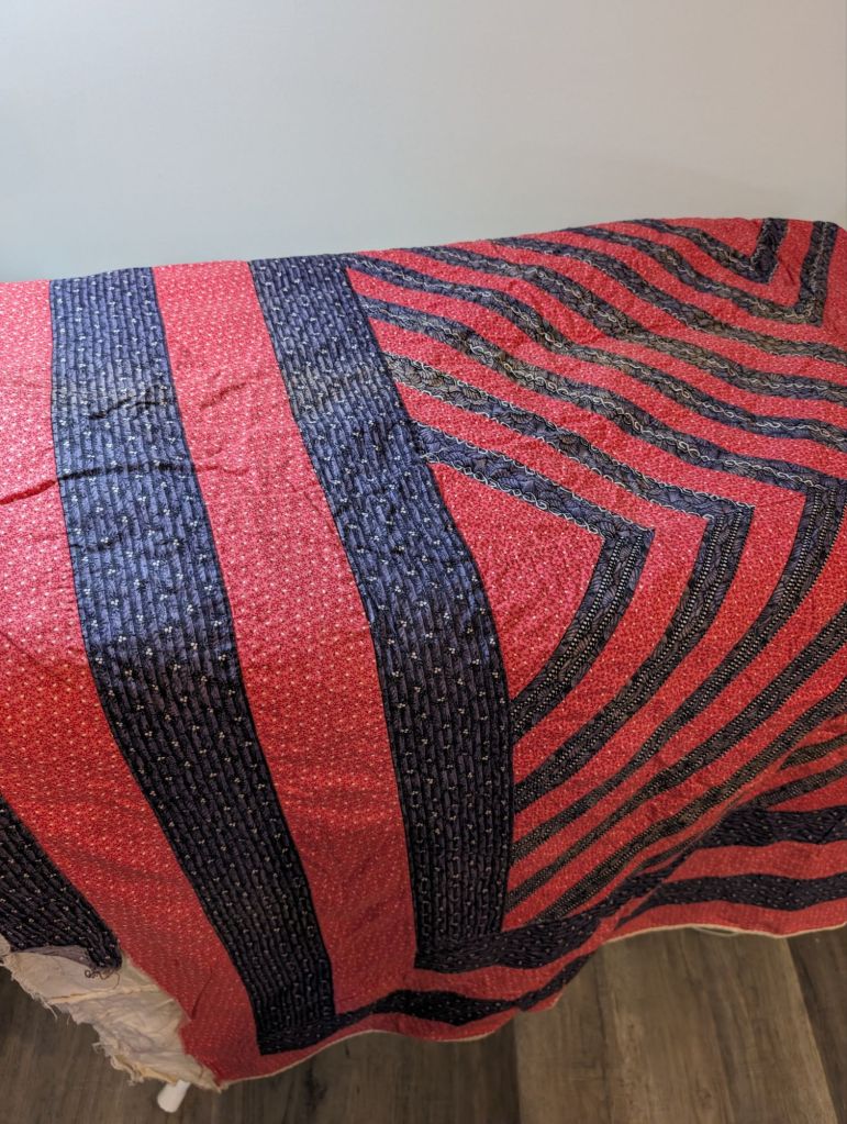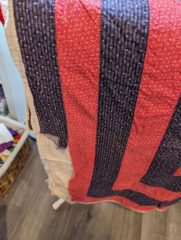 This quilt has some damage, a tear that took off part of the last border for about 10 inches in one corner.