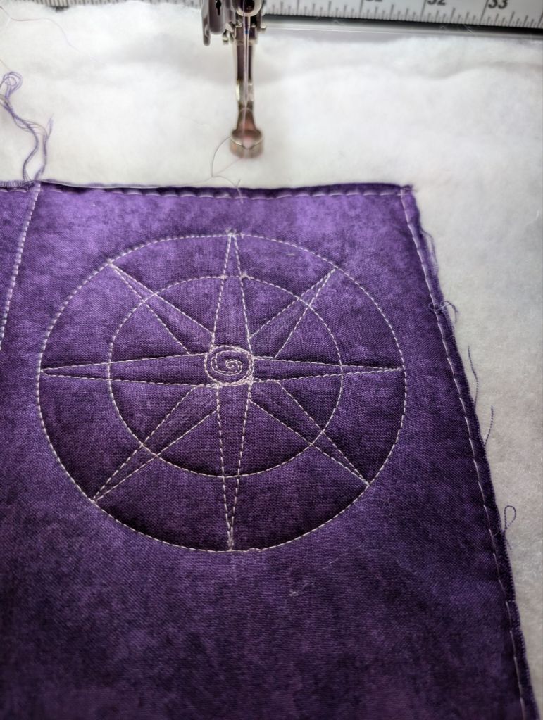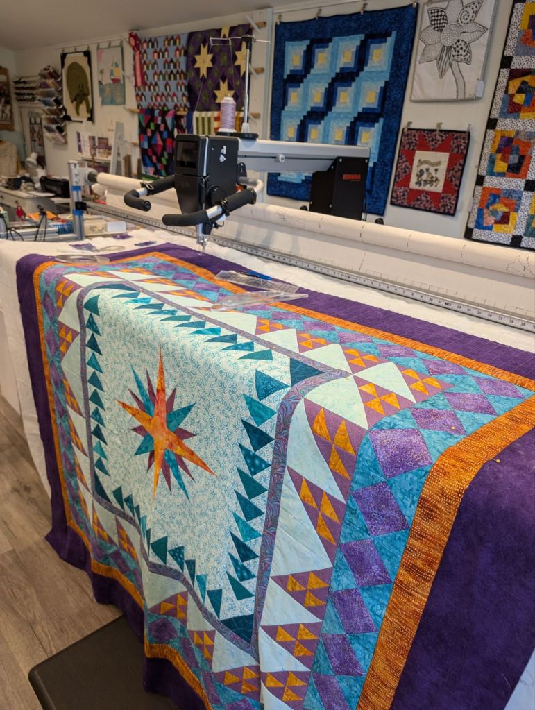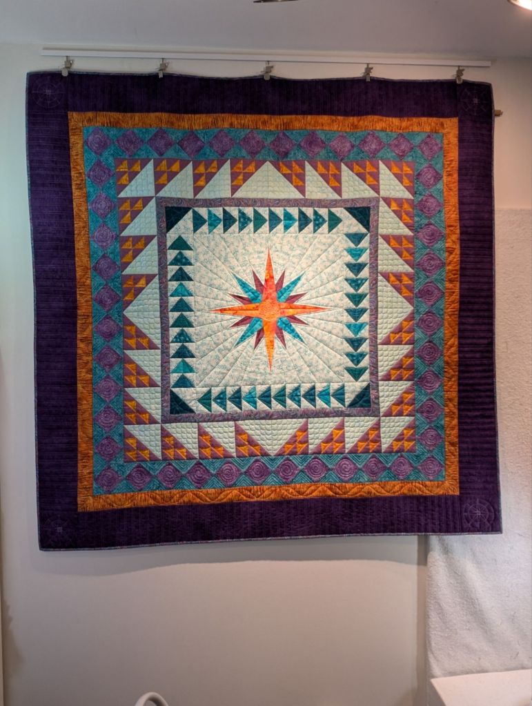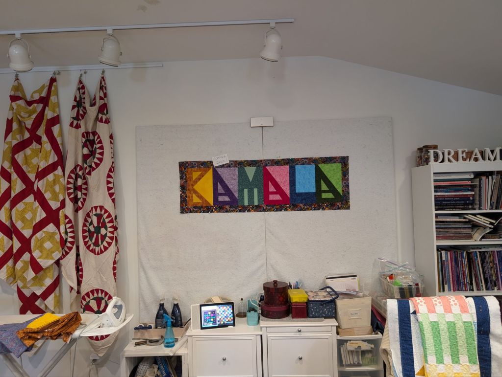 We are in Chestertown this week. The studio will be open from 12-4 today, (Wednesday) through Saturday. The Kamala banner is up on my design wall, as my “coming soon” item. I need to quilt it! But first, my Mariners Compass Medallion Quilt is on the long arm. If you stop by you might see me working on it .